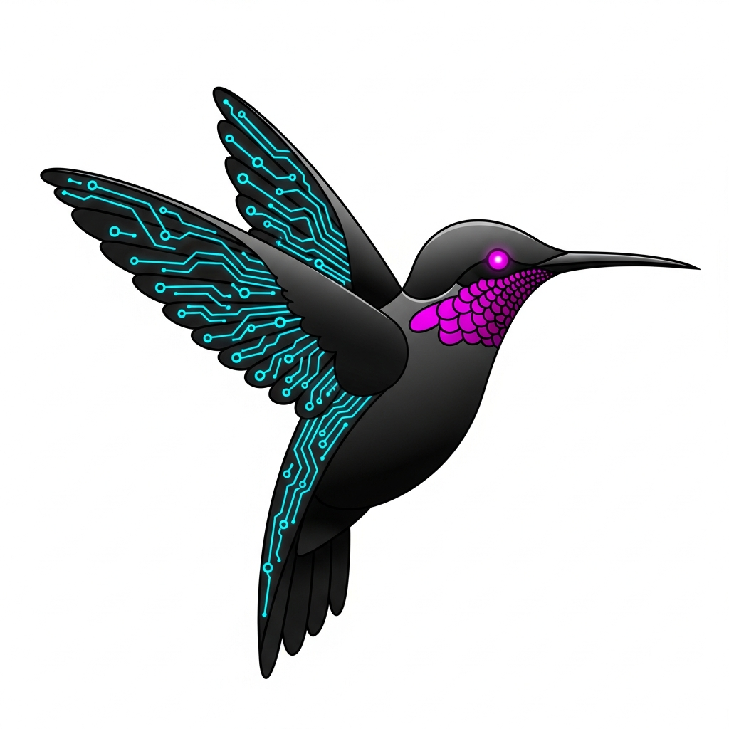 Tags: Futuristic Art, Cyber-Organic, Biomechanical, Cyberpunk Aesthetic, Hummingbird Art, Sci-Fi Clothing, Minimalist Vector, Glowcore, Techwear Fashion, Nature and Technology
